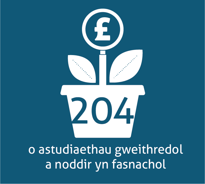 Cafodd 204 o astudiaethau sydd ar waith eu noddi'n fasnachol