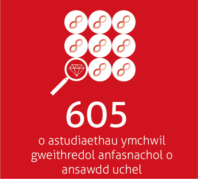Mae yna 605 o astudiaethau ymchwil anfasnachol o ansawdd uchel ar waith
