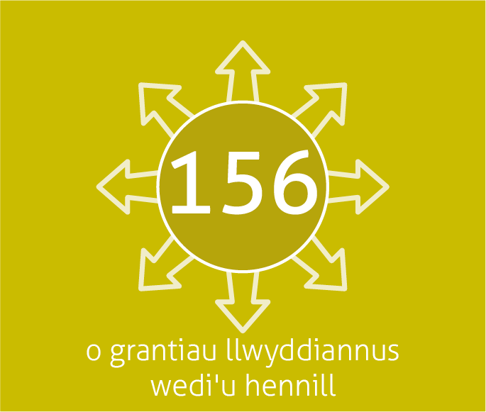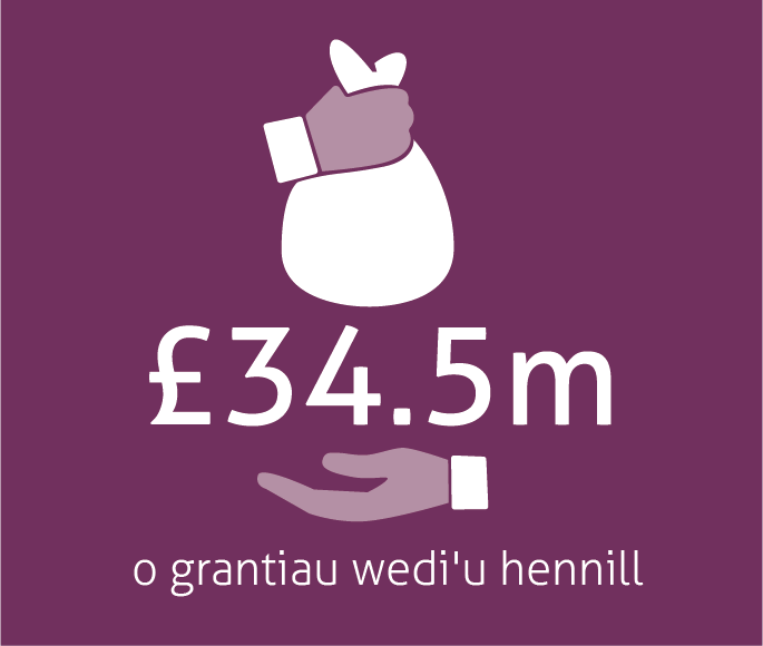 Gwerth y grantiau a enillwyd yw £34.5 miliwn